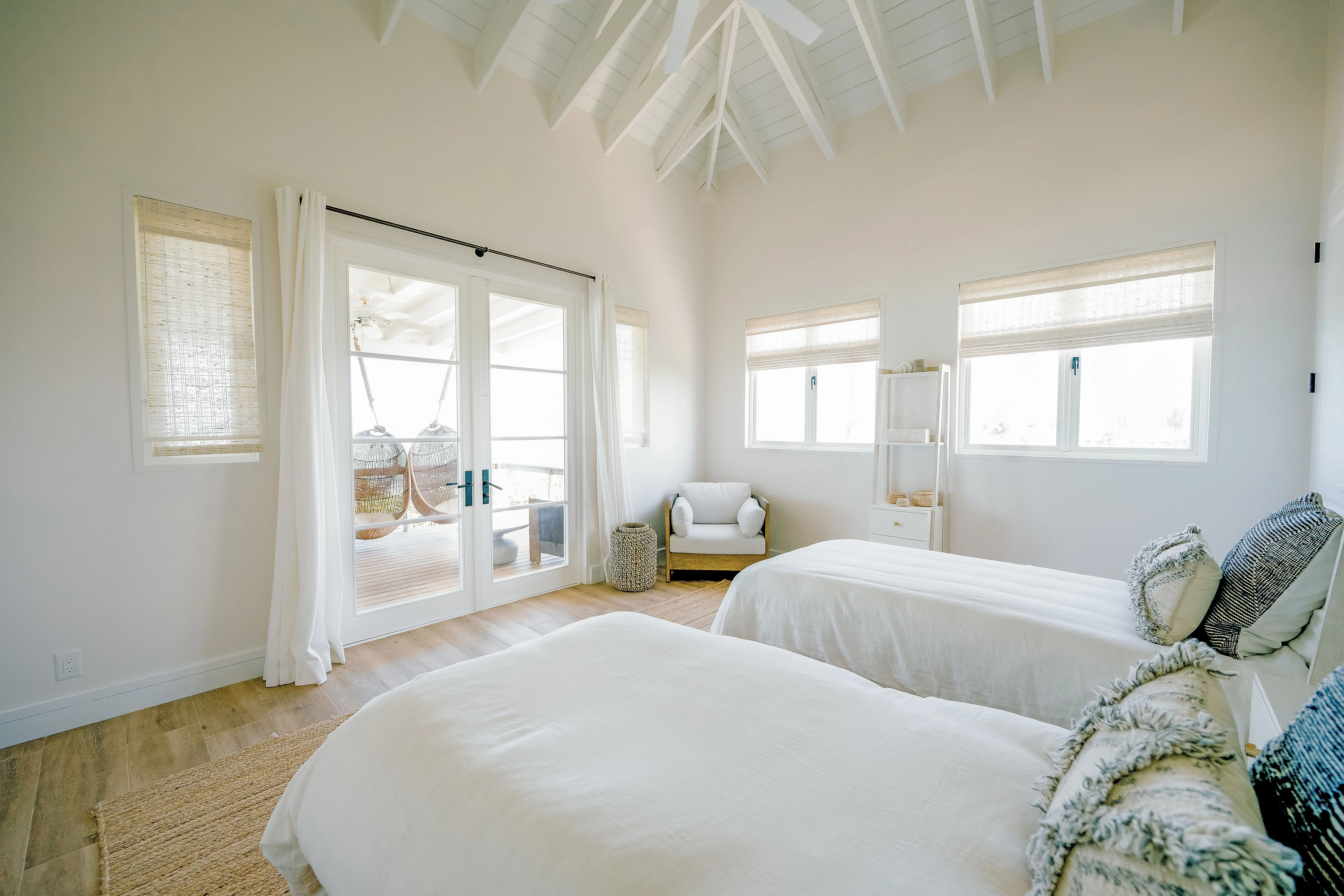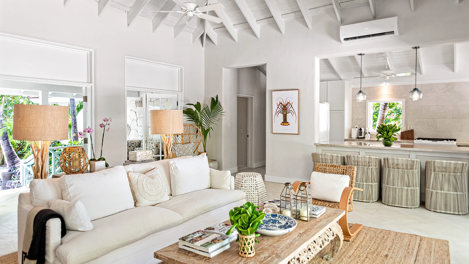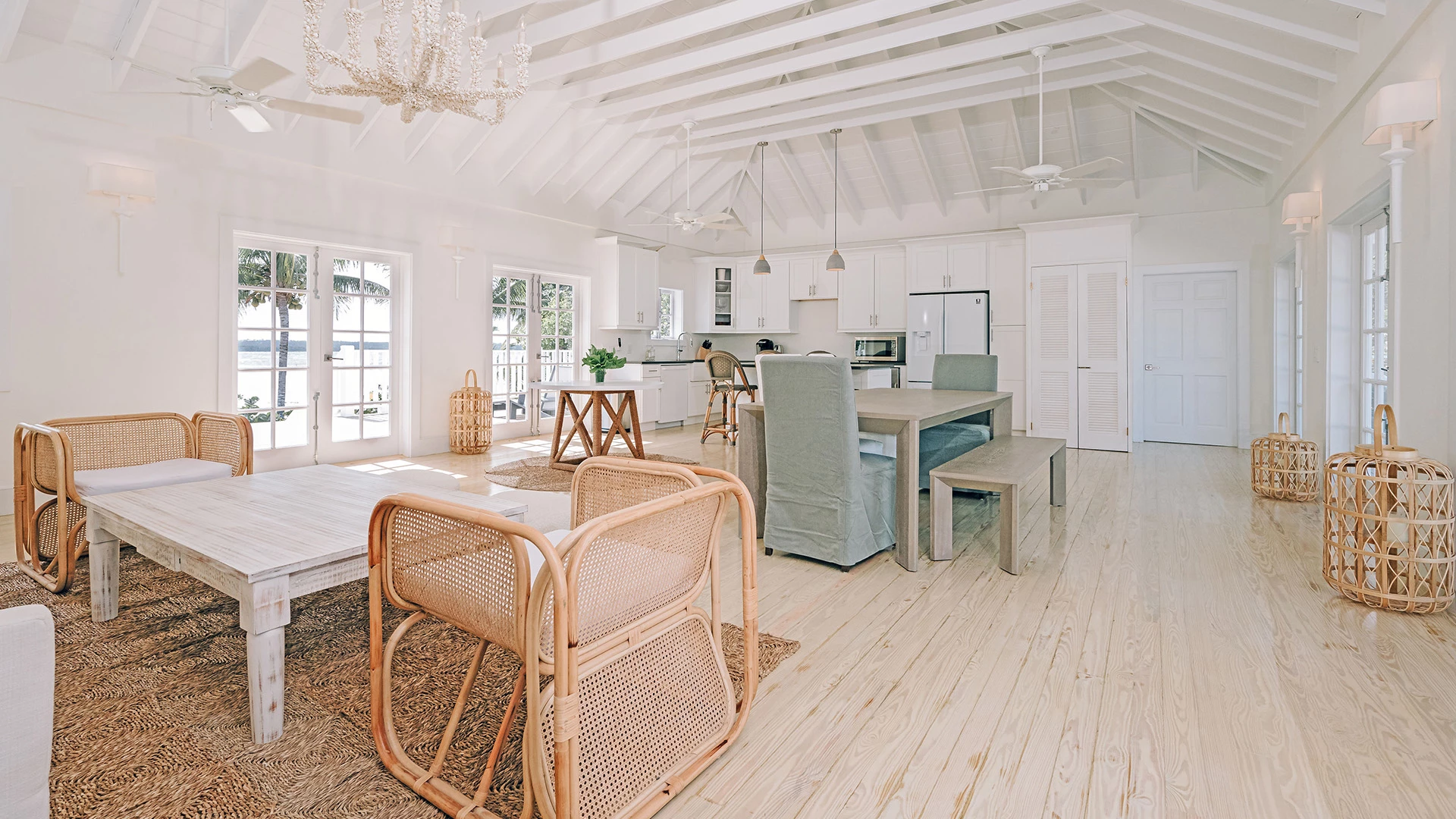 Vaulted, white-beamed ceilings amplify light and air throughout the open-plan living area, while wide French doors dissolve the boundary between indoors and out. The result is effortless indoor-outdoor living, with ocean views as a constant backdrop.