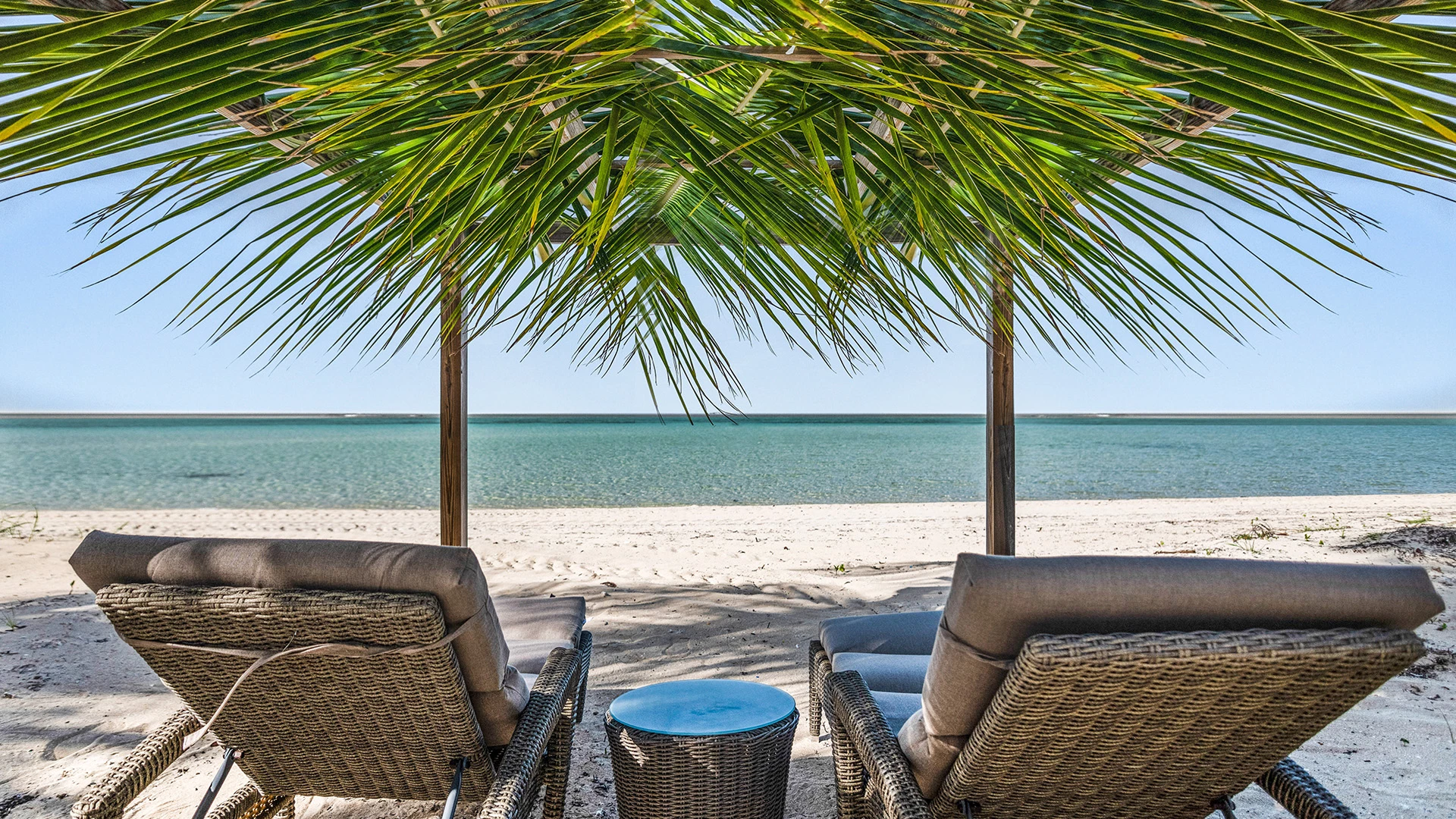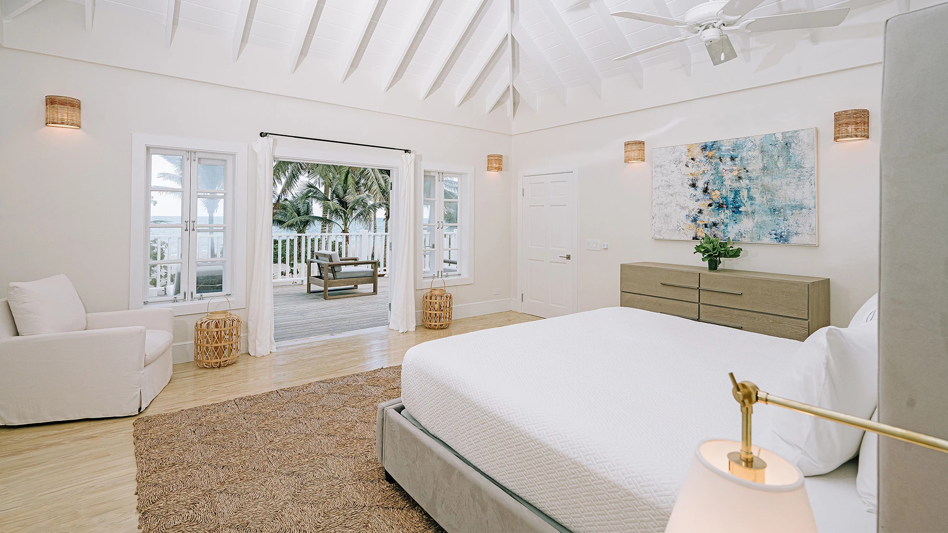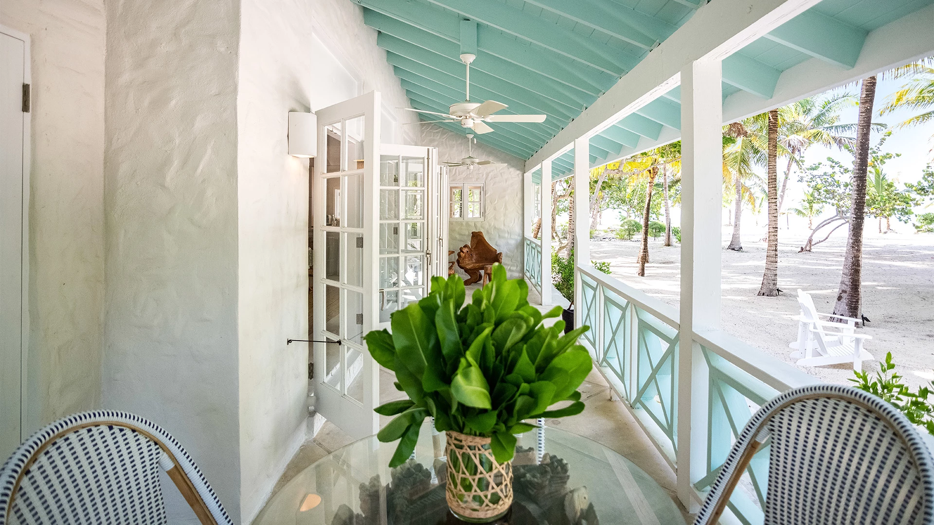 Two generously sized bedrooms provide tranquil sanctuaries for rest and relaxation. Each bedroom features vaulted ceilings, calming décor, and private access to the expansive wraparound veranda, where guests can unwind while enjoying sweeping views of swaying palms and the turquoise waters beyond.