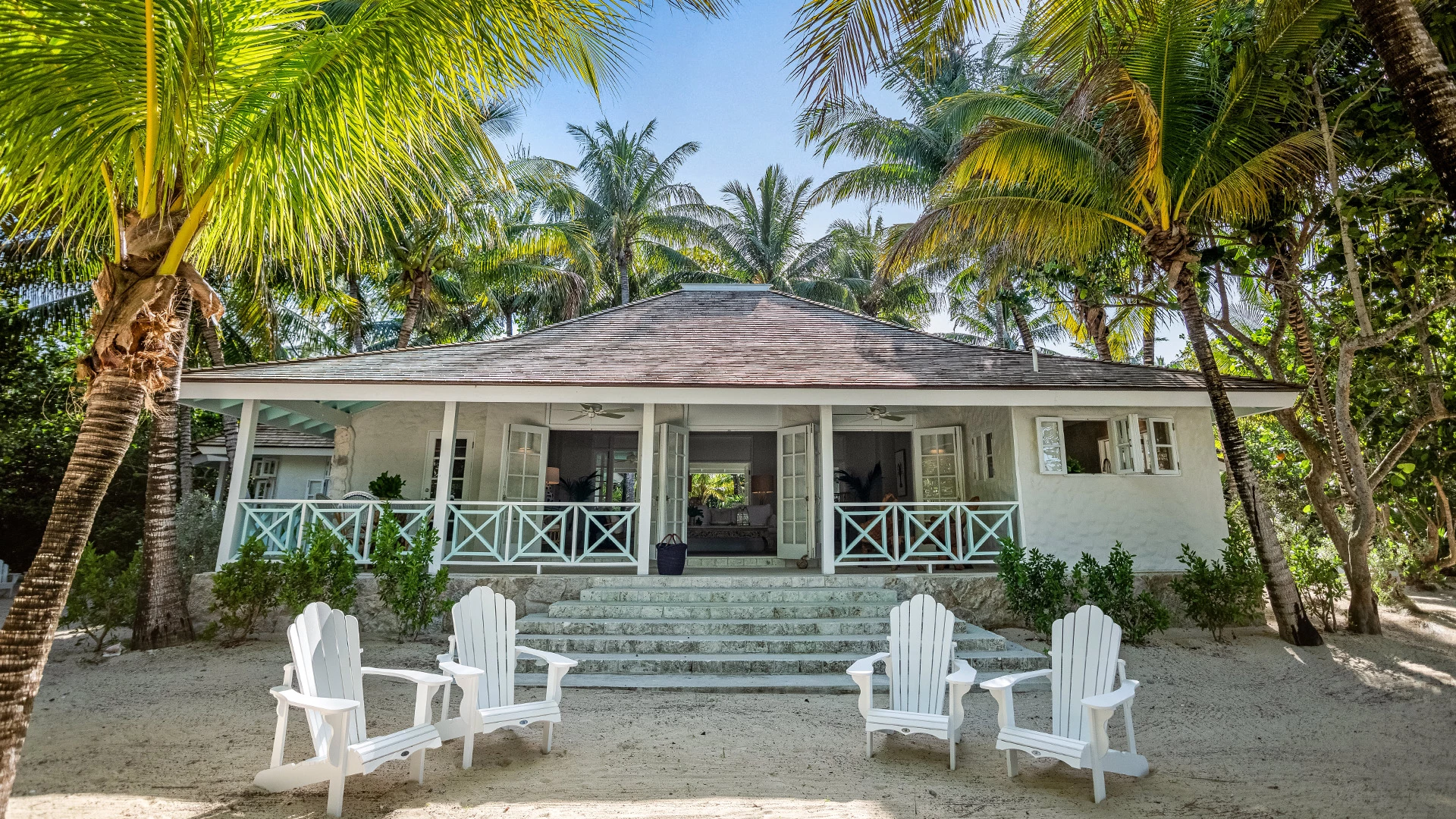Framed by lush palms and native greenery, the cottage’s east- and west-facing decks create a natural rhythm to the day—morning light spilling across the horizon, evenings washed in warm Bahamian gold.