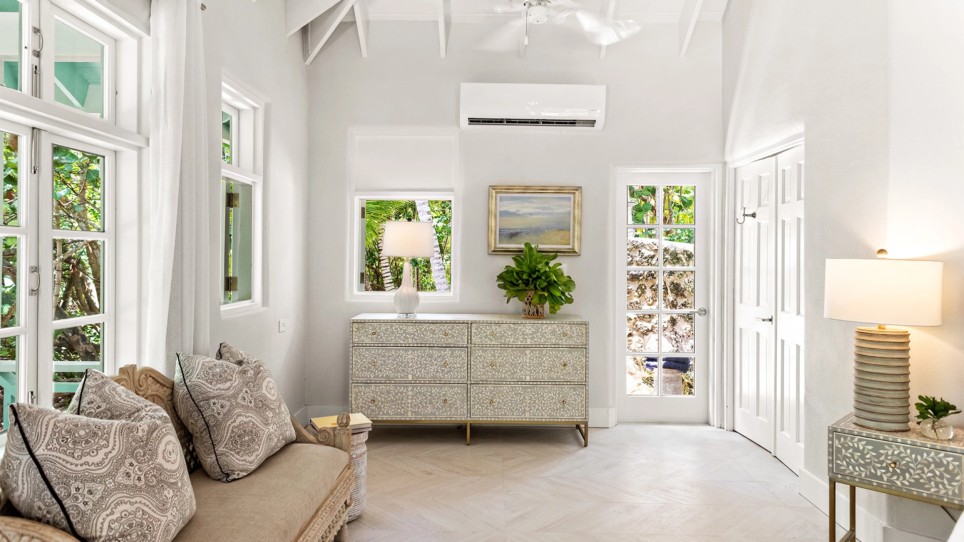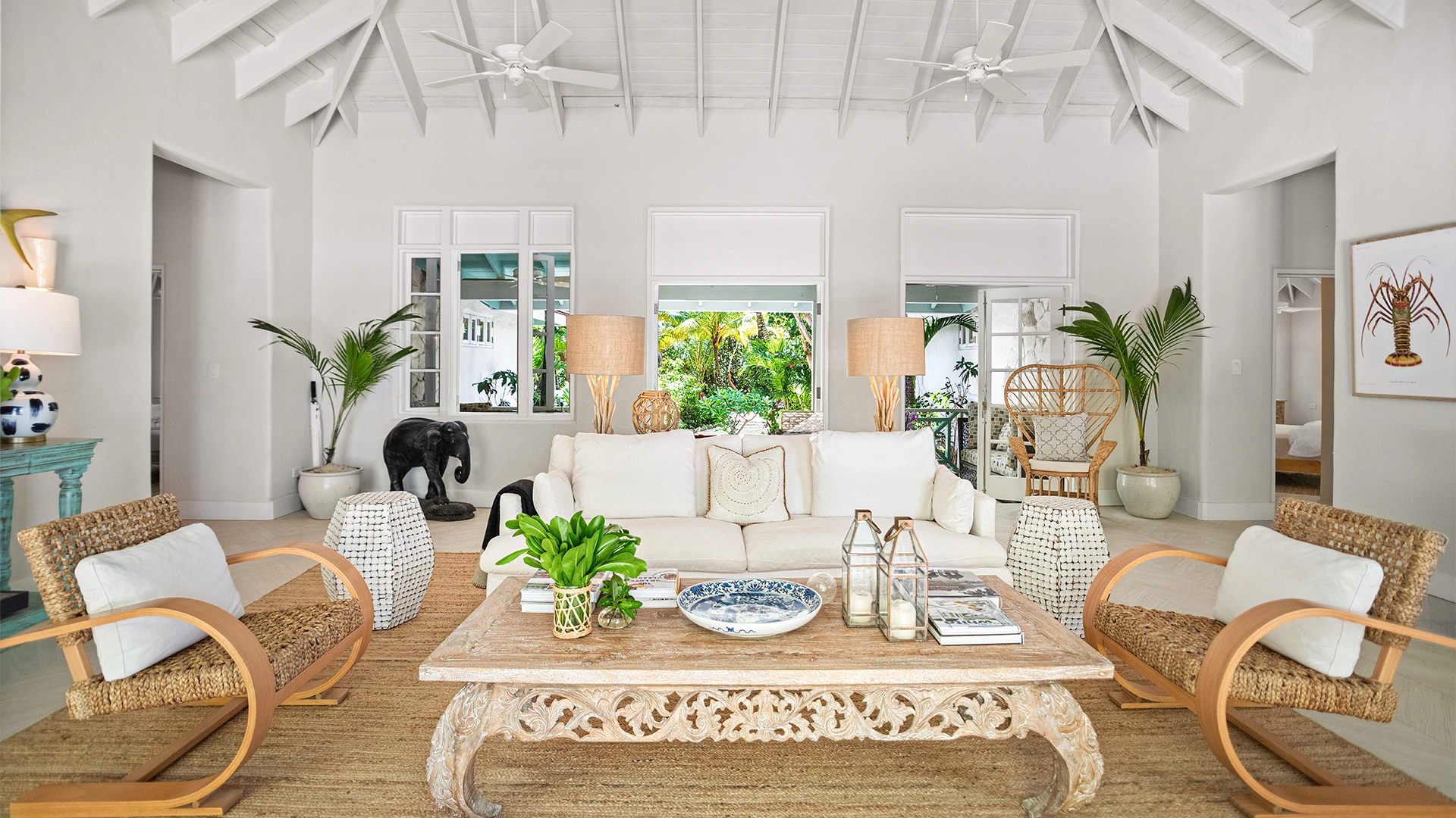 Enveloped in a soothing coastal palette of beige and white accented with graphic Ikat prints and bright splashes of blue and turquoise, interiors blend modern conveniences with a fresh, contemporary take on classic West Indies charm that balances elegant designer fabrics and furnishings against global décor pieces sourced from Bali and India.