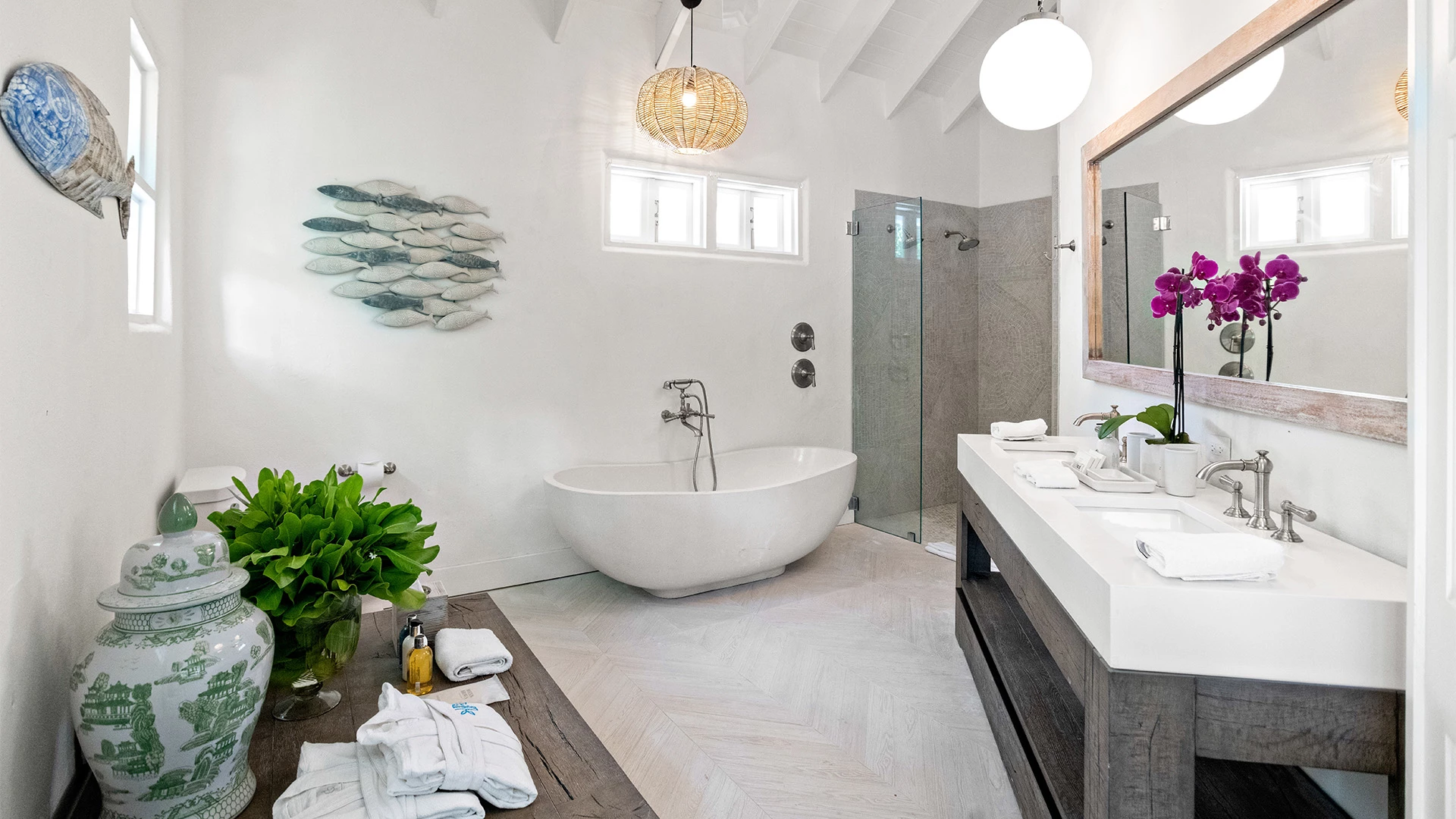 Spanning 1,400 square feet, this two-bedroom retreat blends architectural volume with relaxed island refinement.