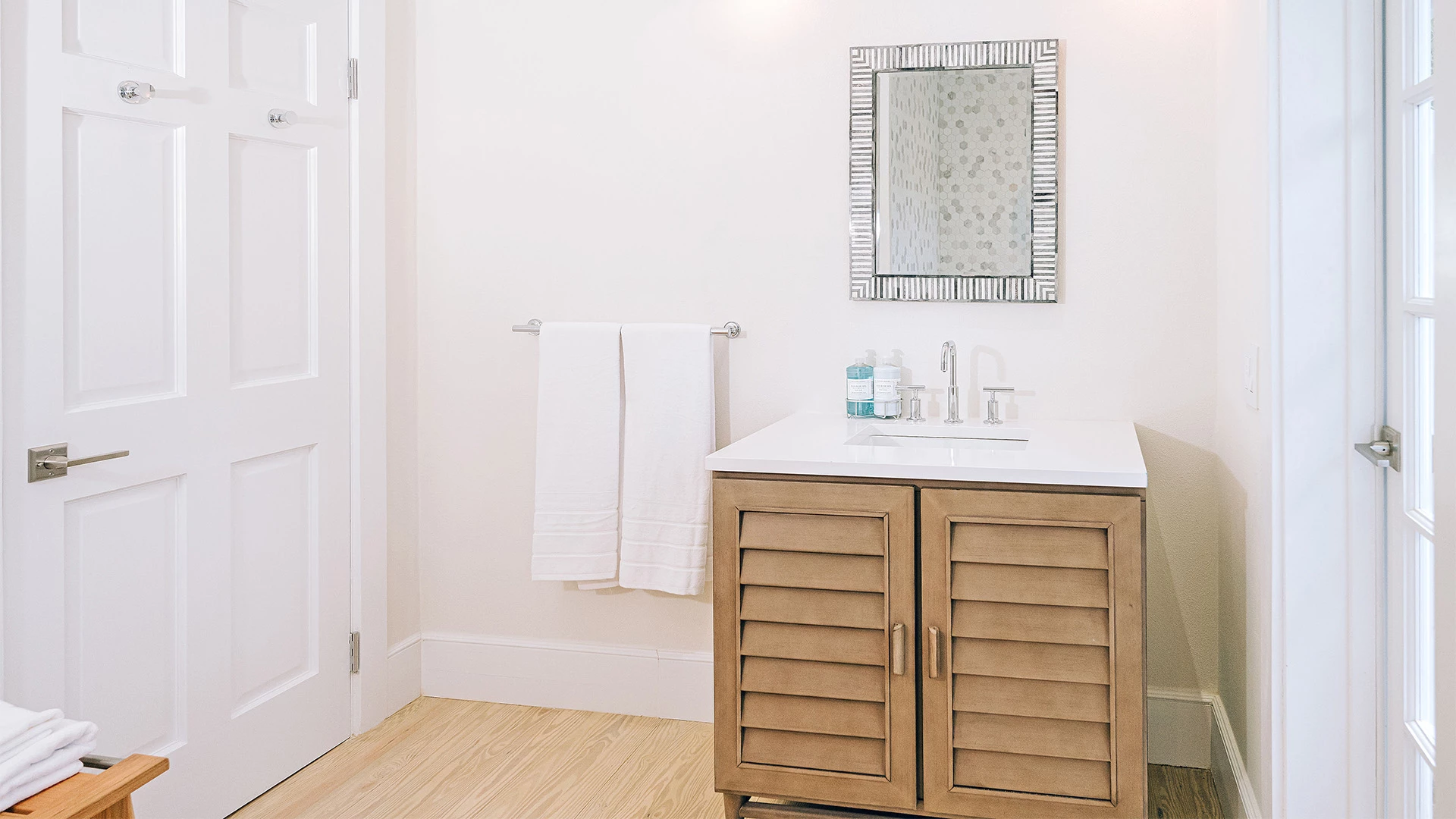 With a stunning mix of modern and beach-infused décor, the cottage was designed to thrive on natural light and let in the cool sea breezes with beautiful French doors throughout the space.