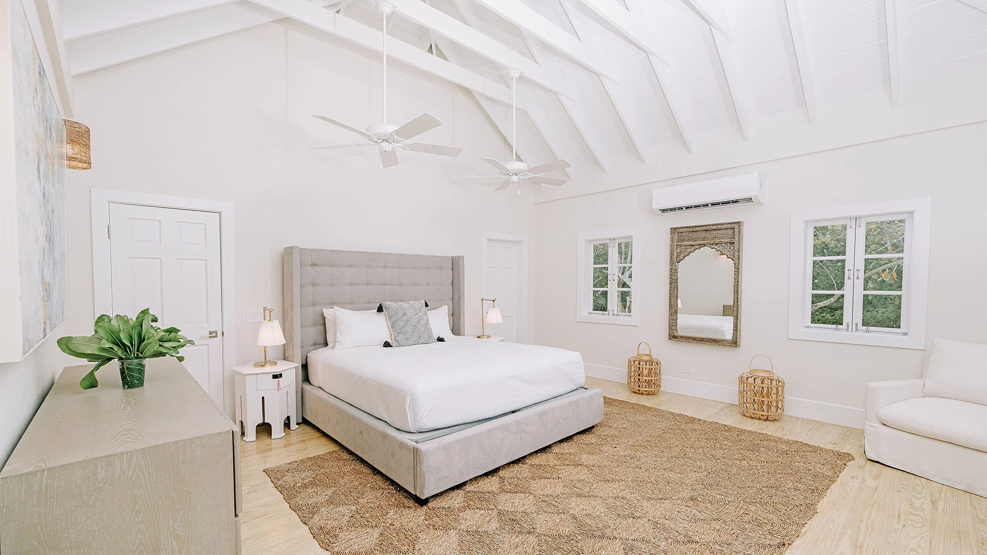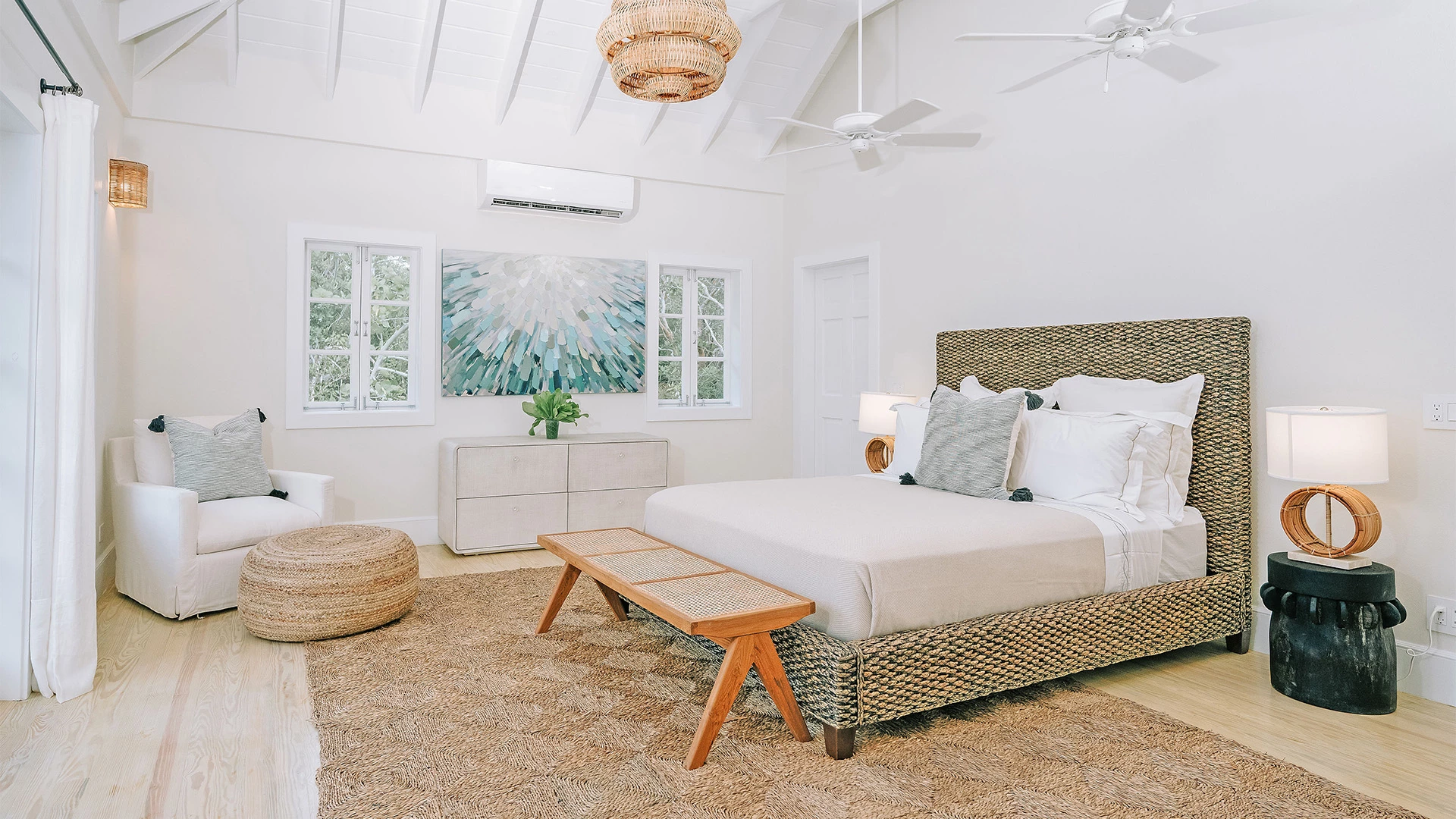 Inside, soaring vaulted ceilings and crisp white interiors create an airy, light-filled atmosphere throughout the spacious open-plan living area. The villa’s thoughtfully designed seamlessly integrates a fully equipped modern kitchen, dining space, and comfortable lounge, all framed by large windows and French doors that invite in natural light and refreshing Atlantic ocean breezes. Natural textures, soft neutral tones, and handcrafted rattan accents evoke a sophisticated yet relaxed island aesthetic.