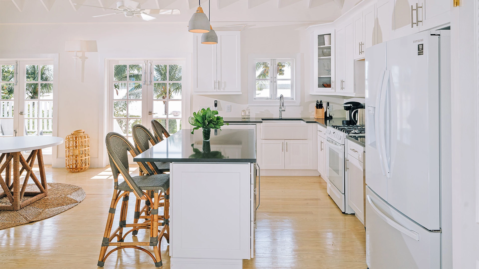 Surrounded by swaying coconut trees, Magnolia’s stylish, sun-splashed rooms offer 20-foot peak ceilings throughout its open concept, living-dining space. The expansive villa opens onto a well-appointed beachfront terrace with panoramic views of the Atlantic.