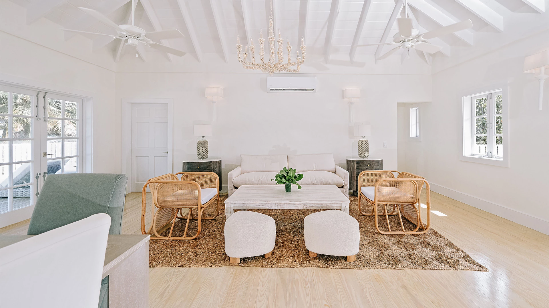 Sun-splashed interiors rise to dramatic 24-foot peak ceilings creating an atmosphere that feels expansive yet serene. The villa unfolds to 2,500 square feet of beachfront terraces, offering panoramic views across the Atlantic Ocean and Blanket Sound, with outdoor dining and lounging areas positioned for quiet, uninterrupted days by the sea. Wall-to-wall French doors invite ocean breezes through the home, while interiors balance modern comforts with a refined take on classic island style — a true retreat for families seeking space, discretion, and tranquility.
